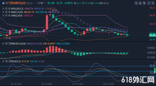 【原油技术面解析 】:原油上周中阴线回吐收低,周初即表现弱势震荡回落,连续的高不破高,最终短线转换回落,上周五伴随拉锯洗盘式的二次探高至86.25.尾盘依旧承压收回低位,周线和日线收低,进行冲高回落的走弱。短线周初将延续回落调整。4小时图的二次探高昙花一现,关键看收盘的位置。以中轨为强弱临界点,探高上回中轨之下,目前中轨是首个阻力点,也是上周五的尾盘反弹最后一个高点。主思路延续反弹高空为主。综合来看,原油操作思路上建议以反弹高空为主,回踩低多为辅,上方短期关注83.5-84.0一线阻力,下方短期关注80.5-80.0一线支撑。