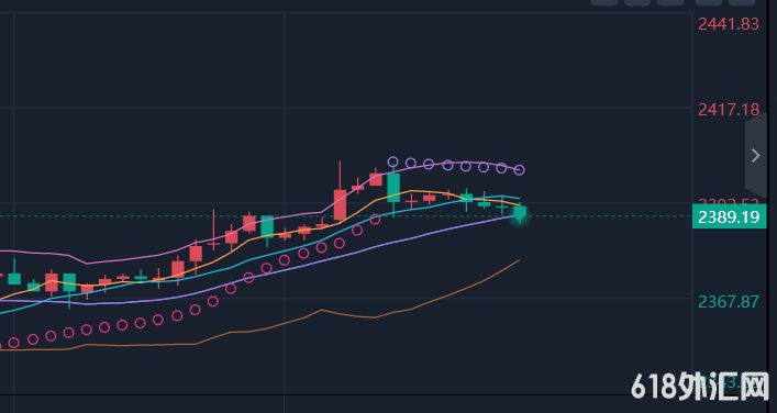 黄金日线图:白盘黄金高开多次触及2400关口上方附近,但都是触及后马上回踩。回踩也是在2390附近一线反弹。维持2390-2395区间震荡多时。目前黄金价格于日线级别布林带中轨2394之下附近运行。