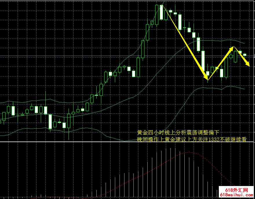 策略三:金价涨破1332顺势追多单,止损4个点,目标1338-1340.