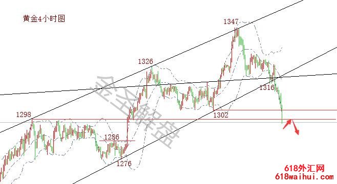 综合来看,日线有顶部结构走势偏弱,目前再次跌破低点,跌破上升趋势线之后继续下行的可能性大,中期关注1280一线。4小时图,均线聚拢下行,整体走势偏弱,盘中跌破重要支撑1290一线,短线走势偏弱,继续下行风险加大,下方支撑重点关注1285-1287一线;布林带方面,受阻于中轨之后承压下行,跌破下轨位置,下行空间打开。KD在50附近形成死叉,关注其下行力度。MACD双线高位形成死叉下行,空头动能柱再次放大,下行动能增强。综合来看,周一操作思路上金圣解盘个人建议以反弹高空为主,上方重点关注1300-1302一线阻力,下方关注1285-1287一线支撑。