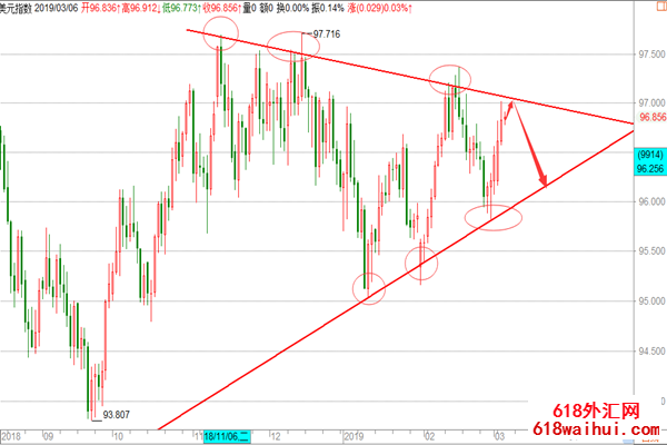 技术面:今天技术面我们要重点去说下美元的走势,在经过昨天的行情,美元再次达到日线级别的锲形三角区域97.1顶部附近,上图可以很明显的看到这里是自去年11月份以来一直沿这根趋势线在运行,而再次回到这里,那么美元大概率会开始一波回撤行情,底部在96-96.2区域,这一点我们从短级别的小时图两小时图内已经可以明显的看到背离形态,空间上已经到位,这是第一.