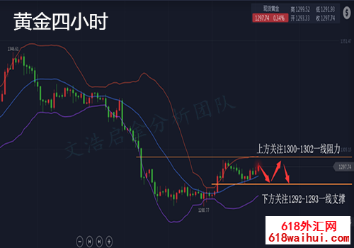 4小时来看,布林带三轨虽然开始向上延伸,但是并不明显,金价短期运行在5/10日均线上方,为金价的上行提供支撑,虽然目前5/10日均线未能形成二次金叉,不过随着金价慢慢的向上运行,形成金叉也只是时间的问题,其他各期均线已经呈现多头趋势排列,sto快慢线金叉继续向上发展,macd快慢线同样是保持金叉运行,不过红能放量的节奏有点缓慢。综合来看,今日午夜操作思路上文浩启金个人建议以回调做多为主,反弹高空为辅,上方重点关注1300-1302一线阻力,下方关注1289-1290一线支撑。