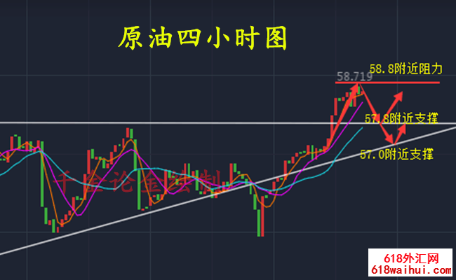 原油小时线的回落,当前作为诱空处理,在关键支撑位置没有跌破的前提下,我们继续多单埋伏,在58附近多单进场,期待行情的再次拉升,防守57.7一线即可!