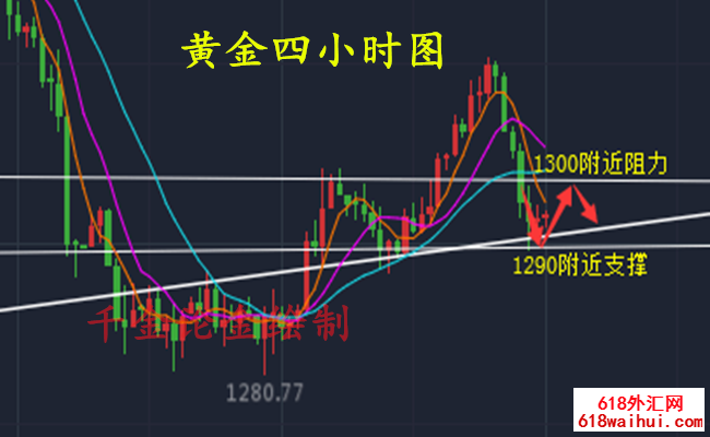 技术面上来分析,金价回落跌破4小时布林带中轨位置,布林带趋向于持平运行,而短周期均线粘合勾头向下,有交死叉的迹象;短线黄金还有进一步回落调整的空间,下方回撤目标重点关注1290位置。综合来看,今日操作思路千金论金个人建议以反弹高空为主,回调做多为辅,上方重点关注1300-1302一线阻力,下方关注1290-1292一线支撑。最近布局黄金、原油无方向感把握不住 或 束手无策的朋友,千金论金会根据你具体的进场点位等情况给你合理的建议。