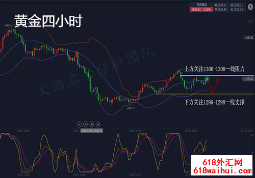 从技术形态来看上周五也是冲高后小幅回落,今天早盘延续了回落的行情,短期而言行情有点偏震荡的意思,从周线收线来看,我认为周线级别依然是空头趋势,目前5周线和10周线死叉运行,短期难以突破前面的大阴线,所以反弹没有改变下跌的格局,而从日线图来看上周四大幅下跌,短期的反抽已经结束,而周五反弹修正,但不足以反转,若日内再次跌破1296附近的支撑,我认为黄金会破位1290进一步测试1280附近的支撑,今日晚间操作上文浩启金个人建议以回调做多为主,反弹高空为辅,上方短期关注1306-1308一线阻力,下方短期关注1296-1298一线支撑。