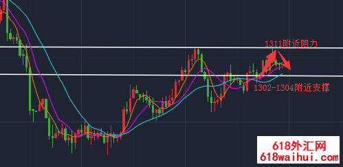 短线图:4小时布林道上轨承压回落收口,探高不破。承压运行有望重新回到下轨处寻求支撑。下轨在1298-1295.小时图则是围绕均线上下洗盘。没有单边方向。短线未突破1311-1292区间之前,以震荡思路对待,介于目前靠近上轨压力处。在未突破1311之前,短线在此位之下轻仓尝试短空。看回区间下轨。当然目标只是参照。回落后有一定收获要及时落袋。操作上1307轻仓短空损1311.50目标1300-1298.若强势突破1311则盘中再调整思路。