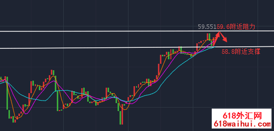 建议一:下方回踩至59.0一线做多,止损0.4美金,目标59.5-60.0附近;