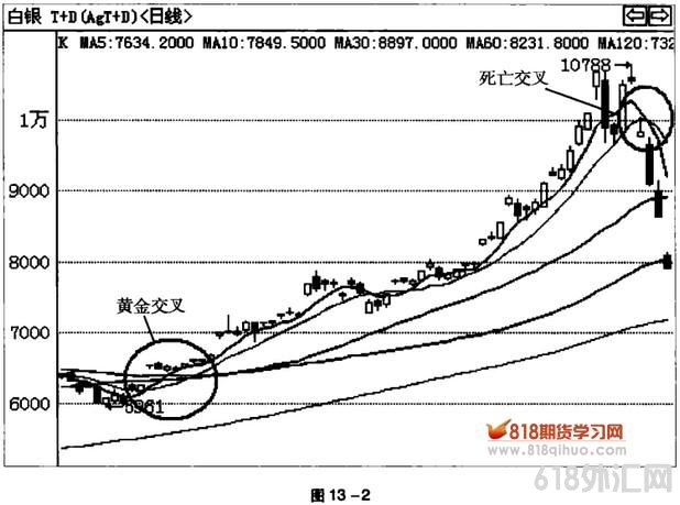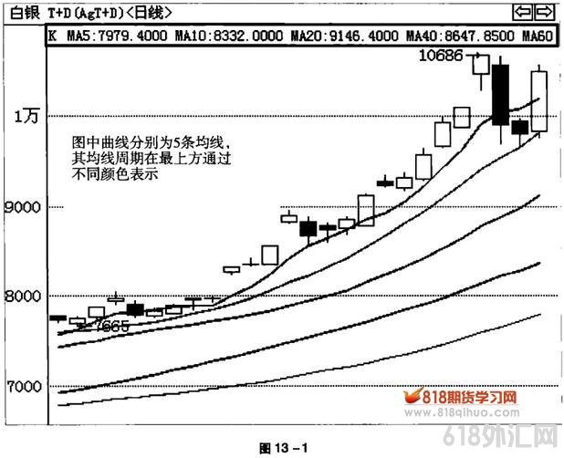 第1节 趋势指标。一、移动平均线(MA) 移动平均线就是将一定周期内白银的收市价进行算术平均得到的连线,它是应用最广泛的技术指标。用它可以研判白银价格未来的运动趋势(如图13-1) 。 (一)移动平均线的计算方法 MA的数值一般是以收盘价来进行统计。"平均"的意思是指某一段时间的收盘价的算术平均数;"移动"是指在计算中始终只采用最近的一定周期数的收盘价数据,随着周期的交替,逐渐向前推移,从而形成一条曲线的运动轨迹。 计算公式为:MA(n)(Cl+C2+…+Cn)/n 以日线为例: 5日平均价=(C1+C2+C3+C4+C5)/5 第六天5日平均价=(C2+C3+C4+C5+C6)/5 把计算出的平均价标在每天的银价图上再进行平滑连接,就得到5日、10日等移动平均线。 (二)移动平均线的分类 根据时间长短的不同,移动平均线可分为短期、中期、长期移动平均线。一般而言,短期移动平均线指周期在10日以下的移动平均线;中期移动平均线则指周期在10~20 日的移动平均线;长期移动平均线则指周期在20日以上的移动平均线。我们习惯把5日和10日移动平均线,作为短线炒作的参照指标,称做日均线指标;把30日和60日均线,称做季均线指标;把120日、240日长期均线,称做年均线指标。 ![]() 根据计算方法的不同,移动平均线又可分为简单移动平均数(MA)、加权移动平均数(WMA,赋予不同日期不同的加权分量)和指数平滑移动平均线数(EMA,平滑因子小时较圆滑,平滑因子大时较为尖锐)三种。而简单移动平均(Moving Average )即算术平均,是最简单也是最常用的一种平均方法。 少数投资者虽然看到看盘软件中的曲线,但是不知道每根曲线所代表的时间周期。这是因为投资者没有注意到看盘软件左上方的MA5、MA10、MA30等时间周期,其中MA5、MA10、MA30均由不同的颜色区分,它们与下方K线图中曲线的颜色一一对应,所以每条线的颜色与对应颜色的周期相同。 (三)移动平均线的用途 移动平均线的意义一般在几个方面: (1)上升行情初期,短期移动平均线从下向上突破中长期移动平均线,形成的交叉叫黄金交叉,预示白银价格将上涨:5日均线上穿10日均线形成的交叉和10 日均线上穿30日均线形成的交叉均为黄金交叉(如图13-2)。 (2)下跌行情启动初期,当短期移动平均线向下跌破中长期移动平均线形成的交叉叫做死亡交叉,预示白银价格将下跌。黄色的5日均线下穿紫色的10日均线形成的交叉和10日均线下穿绿色的30日均线形成的交叉均为死亡交叉(如图13-2) 。 ![]() 1.拐点移动 移动平均线运行一段时间后,会出现波峰和波谷,这就是拐点。移动平均线的拐点非常重要,它通常预示着趋势的转变。当一种移动平均线向上运行,无法再创新高,并显示波峰状,即是白银价格元力创新高并可能转变趋势下行的征兆,这种转点通常又称为卖点。在下跌过程中,移动平均线向下运行,曲线转平并调头时,波谷就出现了,即人们所说的买点。投资者应紧跟移动平均线,及时发现拐点(波峰和波谷)来寻找进场点和出场点。 |