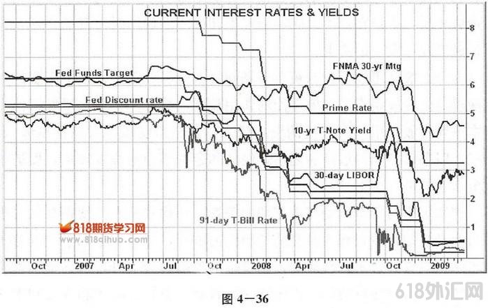 http://www.martincapital.com/chart-pgs/Ch_rtssh.htm。图4-36是一幅示意图,其中有联邦基金目标利率、联邦贴现利率、30年期国债利率等主要利率的历史走势(截至2011年5月26日)。