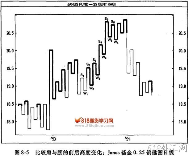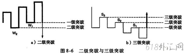 ![]() 肩与腰 前高也称“肩”,前低则称“腰”。如果前后多个肩与腰节节抬高或逐级走低,则充分传达了市场的强势或弱势。如图8-3a所示,图中各肩(标示为S1、S2、S3)依次抬高,各腰(标示为W1、W2、W3)逐级上升,表明市场活力增强,多方有能力维持一个节节走高的循环。图8-3b中,S1、S2、S3依次走低,各腰(W1、W2、W3)连续下沉,表明空方的优势较强。 ![]() 图8-4中,从S1到S5,肩部连续升高,表明多头占优。与此同时,腰W1到W4也连续上抬。钥匙图中这种高低点逐渐抬高的情况,反映市况良好。但在W5处,多头有力量衰减的迹象,因为从这里开始,此前的高低点不断上行的循环被打破了,W5的低点低于此前W4。从长线交易的观点来看,这个钥匙图反映市场为持续走弱形态,因为6~9的几个重要高点和A-D的几个重要低点,都是节节走低的(从短线交易的观点来看,这期间也出现过几次重要的反弹)。 ![]() 股票共同基金的价格只提供收盘价,因为蜡烛图要有开盘价、收盘价、最高价、最低价才能画成,所以蜡烛图不能用来分析股票共同基金。但是,现在我们有三线反向突破图、砖形图和钥匙图来对股票共同基金的走势做技术分析了,因为这些技术分析图形只需要收盘价。以图8-5说明,比较前后肩、前后腰的高度,我们就可以判定某共同基金走势的强弱。图中,从S1到S5,从W1到W5,肩部与腰部逐渐抬高。买方势力衰减的第一个迹象出现在肩部6(S6)和腰部6(W6),因为它们均低于前面的肩位与腰位。此后的行情中,S5成为一个阻力位。 ![]() 多级突破 如第6章所述,在利用三线反向突破图进行交易时,日本投资者会在转向线后等待又一根白线或黑线,以待市场对趋势的进一步确认,同样的策略也可用于钥匙图。在钥匙图中,这种等待意味着让钥匙线突破两个或两个以上的前高或前低,再来确认市场已经走强或者走弱。在图8-6中,每个前高或前低都称为一个“级”。图8-6a中,当一级低点(即前面一个腰部W1)向下突破时,钥匙图中的阳线(粗线)变为阴线(细线)。但是,有些交易者此时还不会进场做空,他们要等待二级突破,也就是说,他们要等待前面的两个低点(W1、W2)都被突破后,才会认定卖出信号得到确认。图8-6b是一个三级突破形态,也就是说图中的上涨突破了此前的三个高点(S1-S3)后,有些投资者才认定买入信号获得确认。 ![]() 任何对进一步确认的等待,意味着等待时间的延长,这对任何技术都不例外,对钥匙图的多级确认技术也是如此,这种等待意味着获利潜力的降低。但是,进一步的确认,也同时意味着趋势转向判断准确率的提高。这也就又回到了收益与风险的正相关这个老话题上,风险越低,必然意味着回报越低。 图8-7中,高点(S1-S5)依次降低,低点(W1-W5)也节节下沉,表明市场走弱。但是,这个高点与低点逐级下移的循环,在S6处被打破。S6构成了一个二级突破,因为它上移到了前面两个近期高点(S4、S5)的上方。此外,从S6处开始的向下回抽止步于前低W5上方,进一步支持了市场底部正在形成的判断,因为这是几个月来,行情首次出现低点上移(W5-W6)。 |