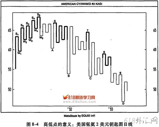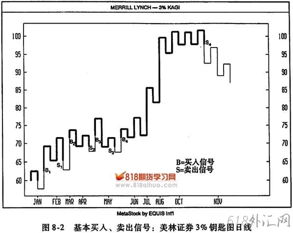 图8-2中标了基本的购买销售信号。 出现阳线(粗线)时构成买入信号,出现阴线(细线)时构成卖出信号。 市场持平时,可以看出图中的购买出售信号(例如B2-S2、B3-S3 )可能会导致损失。 这是因为关键线与三线逆突破图、砖图同样是趋势性交易工具,在趋势不明的市场上关键线会导致高购买廉价,频繁出入(有避免这种风险的方法,是调整关键线的灵敏度。 关于这一点将在后面叙述)。 但是,关键图的目标是抓住长期趋势。 图中的购物B4和卖点S4之间是这样的长期趋势。 这个米林证券的关键图中,有一个积极的信号,表明从1月开始高点和低点阶段性上升,市场很强。 但是,从S4开始,高分和低点都在下降。 下一节将讨论高低点的这种纵向比较及其意义。
