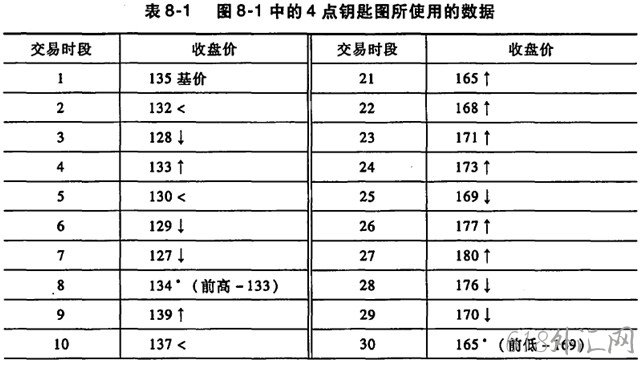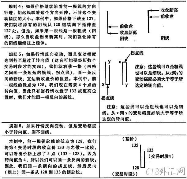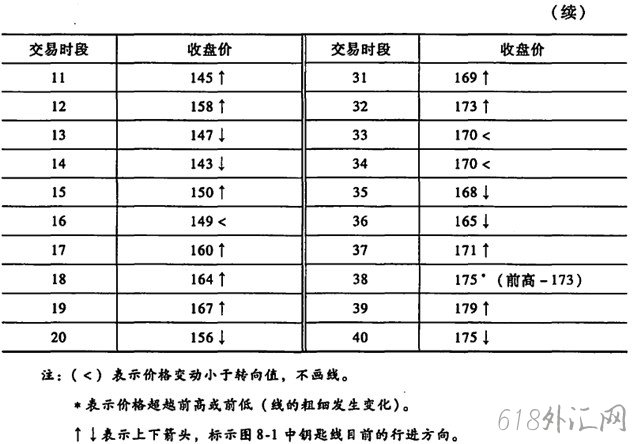在这个例子中,初始价格是表8-1所示的第1交易期间的135。 我们把转向值设定为4个点。
