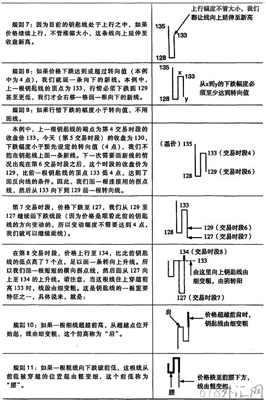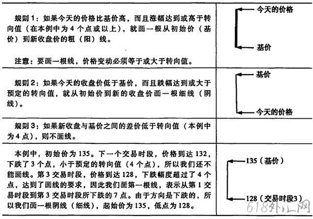 大部分钥匙图采用收盘价。 在绘制键图之前,必须先确定转向值。 行情的逆转幅度必须达到这个预定的逆转值。 我们不能在钥匙图上使反方向的键线向右偏移。 例如,如果转向值设定为3美元,最近的关键线是上升线,今天的价格必须至少下降3美元。 我们不能画相反的下跌线。 后面会详细说明划线的详细规则。 在关键图中,除非行情的逆波动达到或超过转向线,否则无法绘制逆关键线。