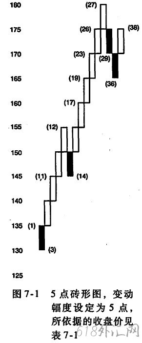 “温故知新。” 图7-1中的砖形图也称乃日图、拖曳图或曲折图。从外观上看,这种图与三线反向突破图相似,都是由一根根黑白柱子构成,每根柱子称“砖头”。 ![]()