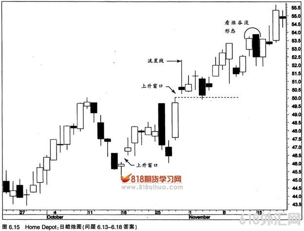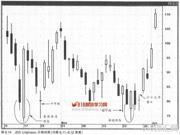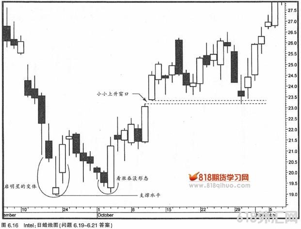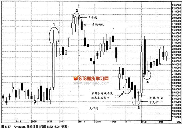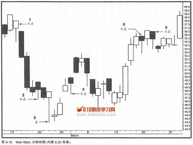 ![]() 12.强调前面提到的看涨蜡烛图信号定义的支撑区域的重要性,市场打开了一个显示更强烈推动上涨的小小的上升窗口。 13.如图6.15所示,有两个上升窗口,一个在十月中旬另一个则在十月未期。 ![]() 14.X蜡烛线是一个流星形态(该蜡烛下影线足够短而足以使它称之为流星)。Y处的蜡烛线信号属于一个看跌吞没形态。 15.是的,一个流星形态是一个潜在的看跌信号。通常情况下它具有长长的上影线并且收盘价位于整个交易日的底部位置。 16.在答案15中提到的流星形态的交易期间,市场打开了一个上升窗口。进而市场在支撑区域内(由上升窗口形成)取得了一个看跌的反转信号(即指这个流星线形态)。所以,就风险与回报水平而言。这个流星形态的位置并不是交易中一个有吸引力的短期卖出点。这是因为,如果您在流星形态的收盘处卖出的话,那就意味着您在支撑线区域附近卖出了。 17.请读者记住,一个上升窗口会构成支撑区域。为了使流星形态传递的潜在看跌信号的有效性获得确认,我们需要看到上升窗口的支撑区域之下出现收盘价。图中的支撑区域已经由虚线标示。 18.对于信号Y——看跌吞没形态,一旦市场的收盘价突破了这一形态的高点的话,就可以被视为是对这一阻挡价位的打破。 19.正如图6.16中的A所示,那里有一个启明星形态,或者更准确地说,是经典的启明星形态的变体。这是因为,传统启明星形态的第一根蜡烛线最好是一根大阴线,而非图中这个中等身材的阴线。尽管如此,第三天出现的这根阳线(这一图形中的第三个交易日)深深地穿入这根阴线的实体之内,以及这三根蜡烛线的实体无一重叠的事实,我们可以仍然将它视为一颗流星。在B处,那里是一个经典的看涨吞没形态。 ![]() 20.形态B是一个看涨吞没形态。使得这一形态成为关键之中的关键的两个重要原因在于:(1)这是对前期启明星构成的支撑线的成功确认;(2)这个看涨吞没形态中的那根阳线不仅仅是包裹住了一根阴线,而是四根阴线(如虚线所示)。 21.在10月8日的那个星期形成的支撑线,是由于市场出现一个很小的上升窗口(上影虚线)。 22.信号A(如图6.17所示)是一根上吊线。这根上吊线在下一个交易时段那根蜡烛线得到了确认(注意,要使上吊线传递的看跌信息被确认,我们需要看到下一个交易日的收盘价在上吊线的收盘价之下)。信号B不是一个看跌吞没形态。尽管该蜡烛线从构成上来看符合看跌吞没形态的定义,一个阴线吞没了阳线的实体。但是我们要记住,一个看跌吞没形态必须出现在一段上升行情之后,而不是下降行情中,正如这个例子一样。信号C是一个孕线形态,因为一个小的实体被包含在了前一根不同寻常的大阴线之内。 ![]() 23.图中1、3、4位置显示的是孕线形态。我不会将信号2视为经典的孕线形态,因为这种形态应该要有一个不同寻常的长蜡烛线作为这个形态的第一根蜡烛线,而在这个案例之中的情况,实体并未达到不同寻常的长。通过这道题,我们可以看到正如西方的技术分析工具一样,蜡烛图分析之中会夹杂着一些必要的主观判断。 24.图中C的这两根蜡烛线意义特别重大,这是因为它们构成了一个孕线形态(详细解说见答案23)并且在61美元附近确认了一个十分重要的支撑区域。 25.图表中唯一的锤子线出现在2月24日。让我们逐一分析每一根蜡烛线(图6.18)。蜡烛线1不是锤子线,因为它并不出现在一段下降行情之后。蜡烛线2不是锤子线,因为下影线和它的实体相比并不够长(下影线的长度应该至少是它实体高度的两倍)。蜡烛线3满足一个锤子线的所有标准,具体地说,在下降的市场行情中且拥有长长的下影线的蜡烛线(至少是它实体高度的两倍),上影线很短或几乎没有上影线,蜡烛线实体位于整个蜡烛线图的顶端位置。蜡烛线4~5、6都不是锤子线,尽管蜡烛线的形状和锤子线一样,但是锤子线的标准之一是必须出现在一段下降行情之后(因为它是一个底部反转信号),因此我们需要一段下降的趋势,来满足锤子线的必要条件。这些蜡烛线都不是出现在下降行情中。这再一次说明,蜡烛线识别的一个首要的条件是:不仅仅是蜡烛线的形状满足条件,之前的市场趋势同样决定着蜡烛线形态预警意义的有效性。 ![]() 26.如图6.19所示,蜡烛线1是一根十字线,蜡烛线2和3都是流星线形态。 ![]() 27.3月20日出现的是一根十字星线,市场跳高开盘,形成了一个上升窗口并构成一个支撑区域。因此,要对十字线传递的潜在看跌信号加以确认,我们必须等到市场的收盘价低于支撑线的底部。在稍后的蜡烛线上,市场出现了盘中一度跌破支撑线的情形。 28.为了确认十字星线传递的看跌意味,我们需要看到市场收盘在上升窗口所形成的支撑区域之下。这种情形发生在3月20日的14:00,一根长长的黑色蜡烛线捕破了上升窗口的底部支撑。 29.h.流星形态 30.b.看涨孕线形态 31.i.锤子线(同样能够认定为蜻蜓十字星线) 32.a.看涨吞没形态 33.d.下降窗口 34.e.南方十字线(在下降行情之中出现的十字线形态) 35.a.看涨吞没形态 36.五三根蜡烛线组成的信号8构成一个启明星形态 37.g.北方十字星线(在上升行情之中出现的十字线形态) 38.c.看跌孕线形态(第二根蜡烛线的实体是如此之小,以至于它同样可以被称之为十字孕线) 39.b.看涨孕线形态 40.i.锤子线(同样也可以看作蜻蜓十字线) 41.a.看涨吞没形态 42.i.锤子线 |