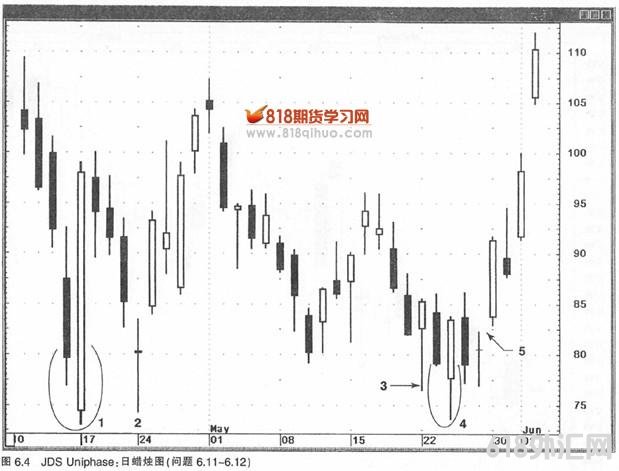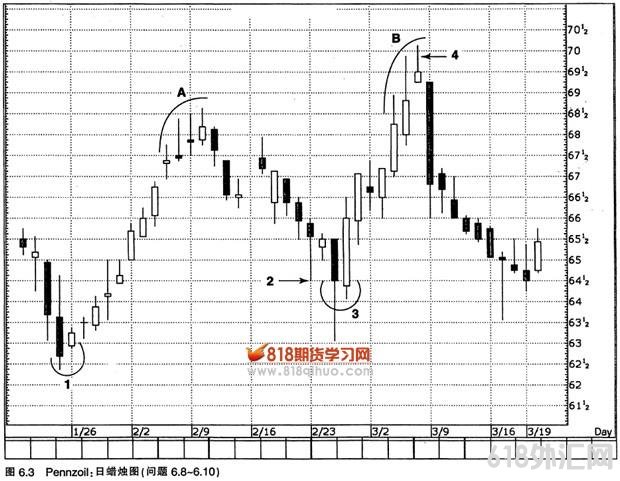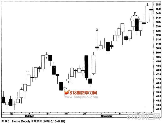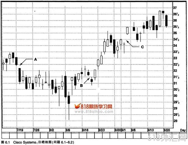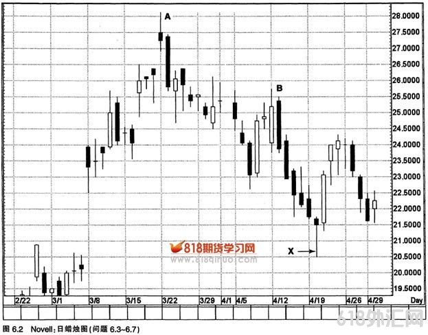 根据图6.1回答第1、2题: 1.在区域A、B、C中,哪个是上升窗口?哪个是下降窗口? 2.他们各自的支撑区域和阻挡区域是什么? ![]() 根据图6.2回答第3~7题: ![]() 3.在3月22日的蜡烛线A之前找出三个上升窗口? 4.根据这些上升窗口,请您画出支撑线应该在哪里?如果在上升窗口顶部位置的第一个支撑线被击穿了,那我们期待的下一个支撑线在哪里? 5.X蜡烛线是什么形态? 6.如果有人在X线之地买入,潜在的阻挡区域在哪里?(提示:连接A到B之间的高点) 7.根据以上问题,在X线的收盘处的买入是否代表了一个有吸引力的风险与回报水平? 根据图6.3回答第8~10题: ![]() 8.请问图中1,2,3,4处的蜡烛线信号分别是什么形态? 9.在A处的蜡烛线是如何提示市场正在减弱上涨的势头,尽管此时股票还在创造新高或以更高的市场价收盘? 10.在三月初(图中B处)股票又创造了另外一系列的新高和更高的收盘价。请问这些蜡烛线显示牛方对市场的控制力度如何?根据图6.4回答第11~12题: ![]() 11.请您回答出在75美元附近的支撑线位置的1,2,3,4处的蜡烛线的名称? 12.请问5号蜡烛线上发生了什么,使得它向市场提供了一个更加积极的看涨信号? 根据图6.5回答第13-18题: ![]() 13.指出图中的上升窗口在哪里? 14.X和Y处的蜡烛线分别是什么形态? 15.X蜡烛线传递的是一个潜在的看跌信号吗?为什么? 16.您会在X蜡烛线的收盘处卖出股票吗?(提示:连接X蜡烛线的最低点和之前一个交易日的高点) 17.什么东西为X蜡烛线提供了潜在的看跌确认? 18.根据Y蜡烛线的出场及其传递的信号,我们应该如何重新评价原来对此看跌的观点? 根据图6.6回答第19-21题: |