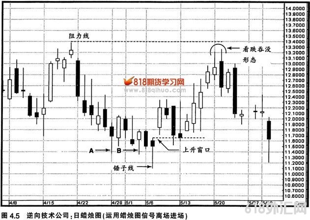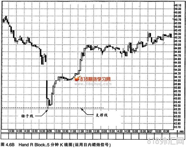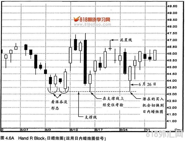 因为蜡烛图通常比条形图传递的反转信号要快得多,蜡烛图会在帮助您把握市场进出的时机上大放异彩。确实,我们有些咨询客户使用基本面分析来决定投资于哪个市场以及操作标的物,然后利用蜡烛图分析来决定买入与卖出时机的选择。图4.5讲解了一个交易员应怎样使用蜡烛图来对进出市场交易进行决策。 ![]() 图中5月7日市场形成了锤子线(虽然具有上影线,但其很短,符合锤子线的定义)。进一步分析,我们把A与B蜡烛线上的看涨的下影线二者结合考虑,正好是显示市场正在恢复元气构建底部的一个预示。我们可以考虑在锤子线出现时建立多头头寸,把止损指令设置在锤子线的下影线底端位置。在锤子线的下一个交易日,市场形成了一个上升窗口,这是另一个积极的看涨信号。在上升窗口形成的几天之后市场出现了向下回调,但是回调途中蜡烛线的收盘价并没看跌破上升窗口形成的支撑区域。(请记住,倘若图中回调时收盘价杀人上升窗口形成的支撑区域的下方,则意味着支撑防线已经失守)。既然这条支撑防线仍然有效,我们就可以继续持有手中的多头头寸。再来研究一下在5月13日为首的那个星期,市场发动的向上进攻。当上攻到在13.3美元的阻力区域(4月19日的最高价,请参见图中的虚线画线处)时,一个看跌吞没形态的出现,给市场提供了一个十分强烈的信号,警告那些从锤子线附近建仓做多的牛方战友们,现在已经到了获利了结使利润落袋为安的良好时机。 在图4.6A和4.6B中,我展示一下众多技巧中的一种,即交易员如何运用日内蜡烛图作为有力的工具,在投资操作中占得先机。 ![]() 从图4.6A中我们可以发现,在43.25美元处有一个坚强的支撑区域。该支撑防线是由6月3日那一周之内的两组看涨吞没形态所构建的。这两个看涨吞没形态所构建的最低防线在6月14日成功地经受住了市场的考验,牛方守住了这个阵地。牛方接着从6月14日开始发动了一轮向上进攻,这次进攻快速地涨到了47美元附近方才停止。标志上攻停止的是一颗流星线的出现。流星线之后的市场展开回调,在6月26日下降到了43.25美元,这正是先前构筑的支撑防线区域,在这里您可以考虑买入。为了让我们买入的时间决策更为精确,我们可以查看一下日内分时蜡烛图,来确定在股票逼近43.25美元时市场是否存在任何买入信号。现在我们将该股票的蜡烛图切换到五分钟蜡烛图,如图4.6B所示。 ![]() 在这幅6月26日的五分钟蜡烛图里,虚线水平线展示了日内蜡烛线图(图4.6A)中所讲到的支撑线43.25美元区域。该水平在盘中交易里由一根锤子线所确认。因此我们可以根据这一基于五分钟蜡烛图所得到的锤子线作为买入点,因为它确认了源自于日蜡烛线图的支撑线水平。这两幅图解释了一个重要概念,即所谓的使用长期时间框架蜡烛图(日蜡烛图)来获得支撑线或者阻力线;而使用短期时间框架蜡烛图(五分钟蜡烛图)来进行一项交易时机的选择。该概念可以扩展到任何的双时间框架蜡烛图。我们可以举例来说,您可以使用周蜡烛图来获得一个有用的支撑水平,进而观察在股票接近该支撑区域时的日蜡烛图,寻找有用的看涨蜡烛信号作为买入的决策依据。 |