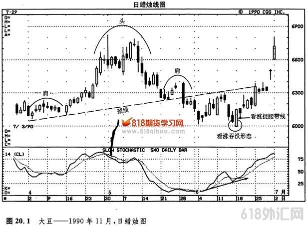 “狡兔三窟” 下面介绍的实例,是我在一个多月的时间中为梅里尔·林奇系统提供的一部分交易建议。在所有这些实例中,均或多或少地涉及到了蜡烛图技术。因为我研究的是期贷市场,所以本章列举的实例以期货市场为取向。另外,我侧重于短期的市场分析,因此,这些实例都是从日内图表和逐日图表中采摘的。每位市场参与者都有自己独特的交易风格。您的交易方式不会等同于我的交易方式。所以在这些实例中,我并不指望您会经历与我一样的思考过程,或者采取与我相同的行动。 本章的目的,不是要为您提供一大套交易规则,其主旨是说明如何将蜡烛图技术融合到自己的交易方法之中。我希望通过这一章的示范,能够起到抛砖引玉的作用,促使您开步前进,走上将蜡烛图技术同自己的市场研究相结合的道路。 如图20.1所示,市场在5月29日向下跌破了一个头肩形形态的颈线。于是,市场趋势转而向下。根据西方技术分析理论,一旦某个头肩形形态的颈线被向下突破了,那么我们预期,首先有一个回向颈线的反扑过程,然后,市场再恢复向下的压力。在6月11日所在的一周,市场便处在向上趋近这条颈线的过程中。6月11日,是一根坚挺的白色蜡烛线。在这一点上,卖出做空的主意并不太有说服力。我需要证据,说明当前的上涨行情已经步入困境。下一天,是一根小的黑色实体,市场凭着这根蜡烛线发出了遇到麻烦的暗示。这就标志着前一天坚挺的白色蜡烛线可能难以为继了。 ![]() 6月13日,我建议在6.27美元的水平卖出做空。其止损水平设置在颈线上方的6.35美元。我们的价格目标是5.90美元(这是根据当年早些时候形成的一个支撑水平作出的判断)。在这一星期余下的几个交易日中,随着市场的下滑,这笔空头头寸看上去挺不错。但是到了6月18日,市场发出明显的信号,显示当务之急是平回空头头寸。这些信号如下所列: 1.6月18日是一根高高的白色蜡烛线,它向上吞没了前一根黑色实体。于是,这两根蜡烛线组成了一个看涨吞没形态。 2.6月18日的开市价向下跌过了6月初的低点,为当前趋势创出了新低水平。然而,市场不久就重新回到了6月初的低点之上。这样一来,就形成了一个破低反涨形态。过去的低点虽然一度被跌破,但是市场不能维持这样的局面。根据这个破低反涨形态,我预期市场将向上重新尝试当前交易区间的上边界,即大约6.30美元的水平。 3.6月18日的蜡烛线是一根强劲的看涨捉腰带线。 4.当前的新低价位在随机指数曲线上没有得到相应的验证。这就形成了一个正面相互背离信号,表明熊方已经丧失了对市场的控制。 6月18日的价格变化显示,当前市场环境并不适合做空。第二天,我便在6.12美元的水平平回了原来的空头头寸。在上述这一实例中,在开立头寸时我主要依据西方技术分析方法,但也采用了一些蜡烛图指标,并根据它们调整了自己对市场的看法。 如图20.2所示,从5月下旬开始,我们看到了一系列逐步降低的高点,它们均处于图示的向下倾斜的阻挡线下方。这就表明当前的主要趋势是下跌的。0.92美元是一个支撑水平,这个支撑水平的形成一直可以回溯到3月底和5月初。6月14日,当图示的咖啡市场向下跌过了这些低点之后,正是寻撩适当价位卖出做空的时候。6月14日是一根长长的黑色蜡烛线,它显示市场的抛售压力很沉重。但是,市场此时正处于严重超卖状态,不宜马上卖出做空。 有一根小实体出现在这根长长由黑色蜡烛线之后,由此构成了一个孕线形态。这个孕线形态告诉我,之前的下降趋势已经转化为中性行情,所以不可以鲁莽地建立空却非寸。现在,市场既有可能形成一个水平交易区间,也有可能发生上涨行情。结果,咖啡市场形成了一段小规模的上涨行情。这段上涨行情恰巧终止于我们所预期的水平——0.92美元附近。为什么0.92美元的水平如此特别,能够成为阻挡水平呢?请回忆这样一条定理:过去的支撑水平能够转化为新的阻挡水平。3月底和5月初的低点位于0.92美元。这一水平现在转化为阻挡水平。在上述短暂的上涨行情中,一旦市场从0.92美元附近向下折回,我就了解到,熊方依旧把持着市场的控制权。6月20日的价格变化问下打开了一个窗口,这意味着市场将形成另一阶段的下降行情。6月21日,当我看到市场元力向上运动到这个窗口的阻挡区之上后,建议在0.9015美元卖出做空,并把止损水平安排在6月20日的高点处,即0.9175美元,其价格目标在0.8675美元(这是根据同一年早些时候的支撑水平提出来的)。后来,市场便开始回落。 |
