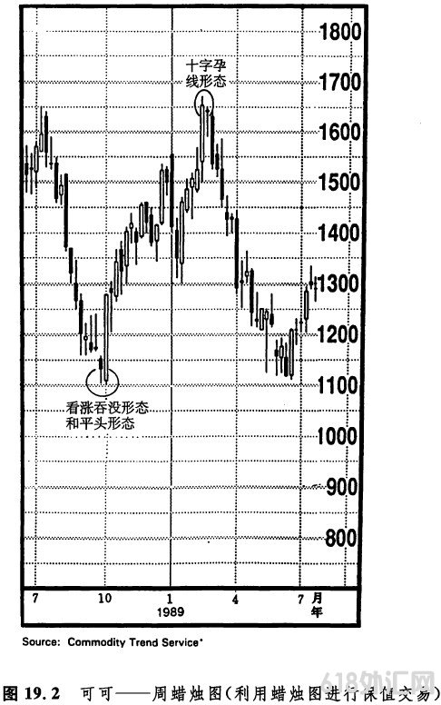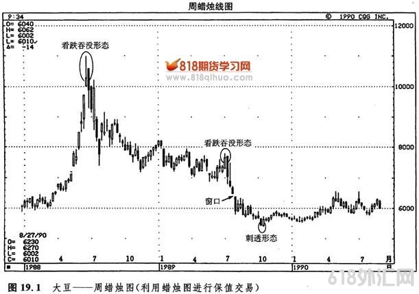 如图19.1所示,1988年该市场发生了爆炸性的上涨行情,价格从6美元上升到11美元,几乎翻了一番。 1988年年中,在这个上涨行情的顶峰附近,蜡烛的图显示了反转信号,即图示的倾倒吞没形态。 如果我们成为顶级反转形态,根据西方理论,这种顶级反转形态要求第二根蜡烛线在现在的趋势中达到最高,及其市场价格低于上周的市场价格。 但是,这种吞食形态的第二天的黑色蜡烛线还没有达到新高水平。 因此,从西方的观点来看,这不是顶部反转形态,从蜡烛的图来看是顶部反转形态。 对于种植大豆的农场主来说,出现这种下跌的吞食形态时,可以将其用作警告信号,制造空头英寸。 或者,如果没有完全保持实物英寸,可以增加保持值的百分比。
