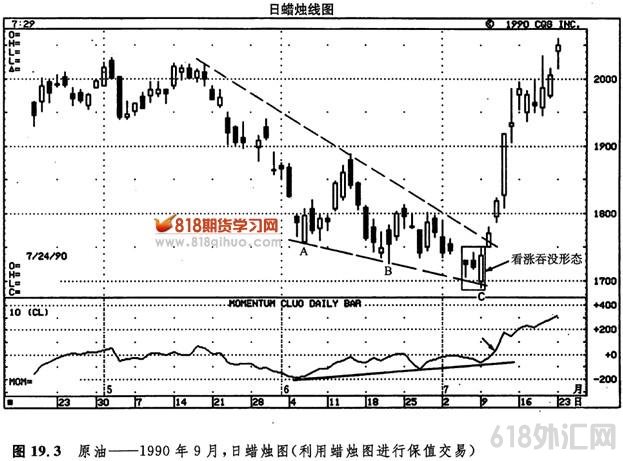 ![]() 1989年,又有一个看跌吞没形态警示着市场顶部的到来(在这一例中,如果我们采用西方的技术分析工具,也不会把它看成一个顶部反转形态)。空头保值商可以利用这个机会,建立保值头寸。几周以后出现的窗口,是另一个看跌的蜡烛图信号。这个信号告诉空头保值商,增加他们持有的空头保值头寸(如果他们还没有100%保值的话。10月里形成了一个看涨的刺透形态,我们可以利用这一信号了结一部分空头保值头寸,减少保值比例。对于寻找机会设立多头保值头寸的人来说,可以以这个刺透形态为信号,建立保值头寸。 如图19.2所示,在1988年9月的最后一周,以及在10月的头一周,市场上集中发生了一群看涨的蜡烛图信号。其中最显眼的,是一个看涨吞没形态。这两个星期同时也组成了一个平头底部形态。另外,其中的白色蜡烛线是一根坚挺的捉腰带线,并且它的收市价位于最高点。这根白色蜡烛线还一口气向上吞没了之前5根蜡烛线。对于多头保值商来说,这是一个很好的信号,既可以借此设立保值头寸,也可以增大现有的保值头寸。 ![]() 在1989年初,出现了一个十字孕线形态(这是一种重要的反转信号),多头保值者不妨据此减小保值比例,平回一部分保值头才。另一方面,这个十字孕线形态是由一根长长的白色蜡烛线和一根十字线组成的,这一事实可能意味着市场已经陷入了困境。正如我们在第八章中所讨论的,出现在一根长长的白色实体之后的十字线,常常是市场顶部的标志。图19.3所示为原油市场。本例探讨了该市场的保值商,如何通过蜡烛图信号来获得一个及早的底部反转信号,然后再利用西方的技术分析工具对之加以验证,进而增持多头保值头寸。第一个尝试性的底部反转线索,出自7月5日的一根锤子线。考虑到这根锤子线从前一天的最低点向下跳空,我们就不应当草率地视之为看涨信号,除非在今后的几天中还有其他看涨指标对它进行了验证。下一个线索,是图示的看涨吞没形态,它为这根锤子线提供了验证信号。与此同时,这个吞没形态本身也是一个非常重要的底部反转信号。这是因为,其中7月9日的白色蜡烛线不只向上吞没了前一根蜡烛线,而是吞没了前两根蜡烛线。在这个时刻,原油市场的最终用户(即多头保值商)应当郑重地考虑是否建立保值头寸,或者增持已有的保值头寸。 ![]() 接下来的一条线索是,点A、B、C所示的价格低点,没有得到下半图的动力指数的验证。这就揭示出如下事实:价格下跌的速度正在放缓(也就是说,市场向下的动力正在减退)。 上面所列举的各项理由已经非常充分地预示,价格即将向上反弹。但是,本例还有其他额外的特征。紧接着上述底部反转信号,动力指数向上穿越零钱,进入了正值区(请看箭头所指处);就在同一时刻,根据传统的西方技术分析理论,图示的下降模形也向上突破了上边界。根据下降模形形态的理论,下一轮上涨行情的价格目标应该在棋形的起点处。对于这个问题,取决于您如何看待这个模形形态的起点。其价格目标既可能设在6月的高点,即19美元的水平上下,也可能设在5月18日的高点,即20美元附近。当市场向上突破这个模形形态时,我们应当增持多头保值头寸。 从本例中我们可以看到,蜡烛图技术能够比西方技术分析工具更早地发出趋势反转警告信号。此处我们还可以看到,将蜡烛图技术同西方的技术分析方法结合起来,恰似如虎添翼一般,能够创造出一种强大的合成工具。相互验证的技术分析信号越多,那么准确地揭示趋势变化的把握也就越大。 |