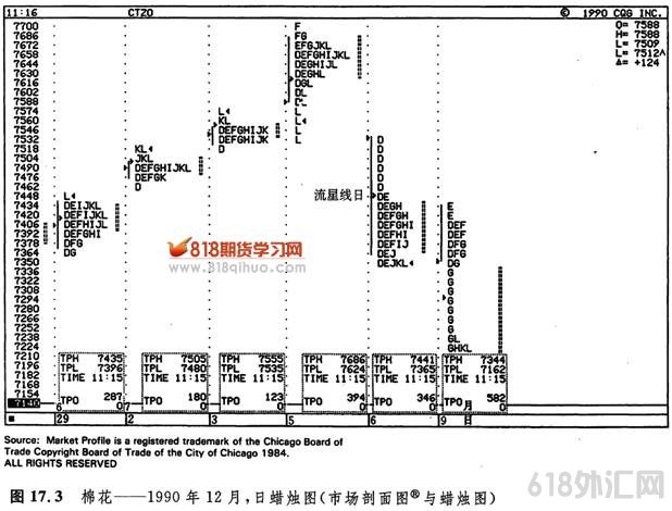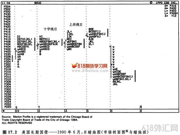 如图17.2所示,7月2日是十字线,第二天是上吊线,这是蜡烛图的上部警告信号。 那么,在同一期间,市场截图发出了什么样的信号呢? 7月2日的剖面图与前一天相比有很小的价值带。 另外,当天的成交量也比较轻(当天的成交量是32000张合同,前一天是303000张合同)。 这种情况表明这里的价格水平太高,很难被市场接受。 换句话说,这样的价格水平对交易活动没有促进作用。 另一方面,这天的断面图上下两个方向都发生了区间扩张。 这说明牛和熊的解锁比赛僵持不下。 ![]() ![]() 7月3日也是一个交易量较轻的交易日(109000张合约)。这就给当日市场种种坚挺的表现打了很大的折扣一一这一天,不仅发生了向上的区间扩展,而且收市价位于全日的最高点。下一天,即7月5日,市场的疲弱性质表露无遗。在当日较早的交易时间中,市场曾经为当前趋势创出了新高。在这个过程中,也形成了向上的区间扩展。市场通过这一区间扩展过程,试图吸引卖出者入市。结果,他们果然来了。在当日较晚的几个时段中(J、K、L时段),市场上形成了一段抛售行情,使得收市价接近全日的最低点。7月6日,当市场开市时就出现了发起性卖出,因为当日的开市价处在前一日的价值区之下。这就表明,当日的抛售活动自开市即刻开始。另一方面,7月6日的交易量呈现出增长的态势,并且在“y”时段内,形成了发起性卖出极端点(也就是说,位于当日剖面图顶部的单个的TPO)。这就证实当前市场已经陷入困境。 通过本实例,我们也能够看出上吊线的一个重要方面,有关内容我们过去有过介绍。仅在上吊线之后出现了看跌验证信号的条件下,上吊线才真正构成一个看跌信号。7月3日,是一根上吊钱。从这一天的市场剖面图来看,它甚至还为市场发出了一些正面的信号。只有通过之后的几个交易日,即7月5日和7月6日,特别是7月6日的早晨,我们才从市场剖面图上得到了这个市场顶部的确认信号。如图17.3所示,7月5日是一根赫然醒目的流星线。在这根蜡烛线出现后,本图所示的棉花市场连续狂跌了三个交易日。那么,在这根流星线出现之前,市场剖面图是否发出了什么明显的不良征兆呢?是的,的确如此。从6月29日到7月3日,虽然价格一路上涨,但是价值区却一路收窄。这就意味在当前的较高价位上,市场对交易活动的便利、促进作用有所减弱。市场在将这些高的价格水平接受为价值的过程中,遇上了困难。另一方面,如果我们统计每一天的TPO总数,以此衡量当日的交易量的话,那么,这几天的交易量也呈现出日益下降的态势(这些交易日的真实交易量也是小的。无论如何,因为交易量的数据要迟一天才公布,所以我们需要统计TPO的总数,以估算当日的交易量)。请注意,7月5日的流星线标志着一个市场顶部。在当日的市场剖面图上,价值区接近当日价格范围的上端,但是未能招保跟进买入者。相反,由于受到这些高价位的吸引,卖出者纷纷入市,驱使市场下跌。结果,形成了图示的向下的区间扩展,以及一个疲软的收市价。这些情况构成了看跌的信号。 ![]() ![]() 如果您觉得还需要更多的证据才能说明问题,那么,只要等到7月6日一开市,就真相大白了。在这一天开市时,市场在前一日的价值区之下形成了发起性卖出极端点。这就证实卖出者已经登台,市场前景堪忧。综上所述,通过市场剖面图的各种工具,图示流星线的看跌意义得到了验证。 在市场剖面图的思路与蜡烛图技术之间,存在着某些有趣的相似之处。如果市场剖面图的价值区较宽,则通常代表着市场对交易活动的促进,因此,这就增加了当前价格趋势持续发展的可能性。由此看来,在上升趋势中,我们期望看到逐步扩张的价值区。与此相似的是,在蜡烛图上,我们希望在上涨行情中看到一系列越来越长的白色实体,以证实当前价格运动背后的市场力量。 如果市场剖面图的价值区呈现出逐步收窄的局面,则反映了市场对交易活动的促进作用的减小。因此,判断当前价格运动能否持续发展,就少了几分把握。在蜡烛图的前方受阻形态和停顿形态中,情况与上述也是一样的。在这两种蜡烛图形态中,虽然价格趋势依然是上升的,但是在此过程中,白色实体的高度却在逐步缩小。这两类形态显示,当前的市场动力正在逐步衰减。 至于蜡烛图的星线,情况又怎么样呢?这是出现在上升趋势或下降趋势中的一种短实体的蜡烛线。它的出现,标志着牛方(上升趋势中的星线)斗志的消退,或者熊方(下降趋势中的星线)动力的减弱。在市场剖面图上,如果在一轮强烈的上涨行情(或下跌行情)之后,出现了一个小价值区,则说明了与上述相同的道理。这里的小价值区反映出市场对交易活动缺乏促进作用。这种情况可能是趋势即将生变的先兆。再看蜡烛图的锤子线。在剖面图上,由于低价位吸引了大量的买入者,从而产生了买入极端点,这种情况反应在蜡烛图上,可能就形成了一根锤子线长长的下影线。流星线呢?由于高价位吸引了强烈的抛售行为,造成了卖出极端点,这种情况反映在蜡烛图上,可能构成某个流星线长长的上影线。 |