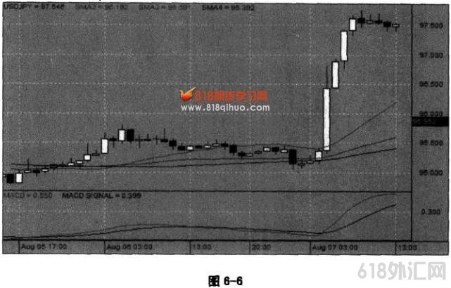 通常看到这种形态我们就会兴奋,因为它有一种张力在里面,是缓慢而有推动力的,这时就可以进场。所以在小阳线或小阴线的状态下进场,感觉是最好的。不一定非要三根线,四根、五根都可以,关键看感觉到没到位。 你们自己也可以到行情中找找看,有很多类似这样的形态,经常会出现,往上和往下的弧形,上涨比较缓慢,像台阶一样一步一步的往上涨,可下跌往往会出现大阴线,很多下跌是一下子掉下来,这就是多头行情和空头行情的区别。 行情背景:美元对日元看涨交易方向:买多美元 图6*6,你们的注意力也许会放到后面三根大阳线上,其实整个行情发展过程中,在前面就已经有买进去的冲动了。比如在6日3:00之前时那一段,虽然有点但前面有一连串的小阳线和小阴线的组合,并且慢慢地往上抬高,但是它的形态并不完美,我们看见它是在往上运动,但是没有那种弧形张力的感觉。后面它来了一根很小的小阴线,把前面的感觉稍微破坏了一点,虽然后来它又涨上去了,但是感觉不完美。尽管如此,还是有一种想买进去的冲动,就是没有找到合适的位置,或者说感觉没有到位。