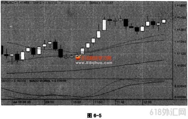 我这是举一个例子,让大家去体会,并不是告诉你在这种情况下就可以建仓做多。高手之所以敢做,是因为有前面的行情作为铺垫,这种上涨的感觉还在,行情还在盘整,但今天总的趋势是往上的,所以岜出现了一个比较清晰的逐渐收敛的能量衰竭态势,出现了十字星这个力量平衡点的时候,就有可能是一个进场点。当然也不一定非得买进去了,可能还要确认一下。 这幅图是举个例子,说明在有些时候对行情的动向感觉非常强烈,但是行情•直在很别扭地进行盘整,盘整到后来,会逐步调整出一个比较有规律的状态,这就预示后面这波行情趋势即将到来了.这就是具有关联性的几变征兆,一旦这种感觉形成,就立刻去抓住它,这时往往会有意外惊喜。 行情背景:欧元对美元看涨 交易方向:买多欧元 图6-5的阳线上涨也是比较典型的形态,盘整了以后,一点一点有秩序地往上涨,是一个比较完整的形态。这个进场点,如果按传统的方法是在突破整理区高位的时候,但实际上根据我的经验,10:20前后出现三根类似这种形态的小阳线的时,第四根线只要是髙开躭一定是进场点,只要第四根线的开盘价高于第三根线的收盘价的话,就进场了,不用等突破了再进场。大家不妨注意观察,越是小的阳线,越是慢慢地往上涨,那它越是稳健,当它走了三个时间段,它的方向性就越确定,你只要把止损设在前面那根线的最低点,如果行情走反,万一掉下来,你就平仓走人。