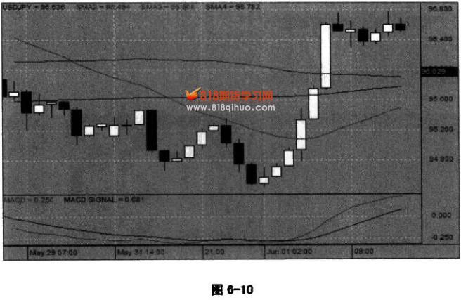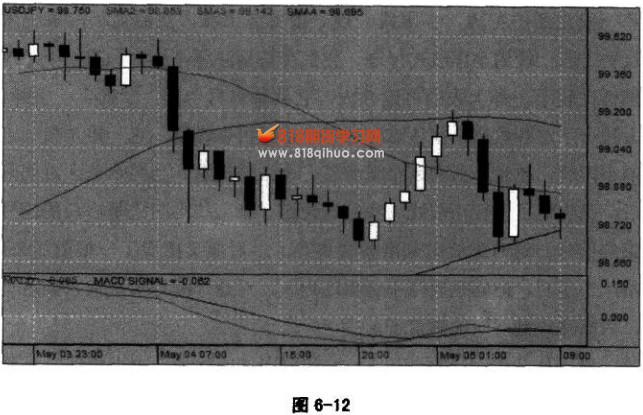 我以前做过很多回这样的交易,每次都很成功。但是这次很奇怪,我居然没有找到一张这样的行情图。大家可以回去自己去找找看。 这个背景假设为上涨中的回调,图6-10里面有两处很典型的买入信号。 ![]() 一处在21:00,之前有三根小阳线,这是一个买入点,只是它最后没有发展出来,在出现第一根阴线的时候,就被平仓或被止损掉了。只要在第一根阴线结束的时候平仓,这单交易本身就没问题。