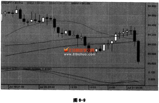 交易方向:卖空美元 图6-9的行情背景是下跌,大家找找看卖空的机会在哪里? 前段行情一边震荡一边往下掉,但是从形态上看,在下跌过程中没有一个明显的进场点,判断不出来。虽然知道行情在往下走,但是很难找到进场的机会。 如果硬要找也可以,找一个突破或者反弹的高位,但是对我们时空交易系统来说,那不是机会而是在冒险。 现在行情走出来了,我们看着图知道它是一个下跌的过程,在行情没有走出来的时候,你怎么知道是怎么回事呢? 这样的行情整个形状是零乱的,没有建仓的机会。一直走到23:00以后,这里走出了一个反弹行情。当连续出现小阳线,出现十字星的时候,我们感觉这时它可能反弹到顶了,有一种反弹不上去的感觉,如果是在盘感比较好的情况下,有可能就在小阳线的低点挂个空单卖进去,后面就是两根阴线。这就是抓住一个反弹的机会,找到进场点。 ![]() 在这个形态中,阳线反弹的趋势是从大到小,一点一点地衰竭,最后形成了一个像十字星一样的小阳线. 这张图的形态不是特别完美,不一定非得进场,我只是给大家看个意思。如果最后那根十字星小阳线没有上下影线,或是接着开始出现了小阴线,要是连续出现一二三根小阴线的话,那就是比较完美的卖空信号。但完美的信号往往是一种理想,出现了当然感觉很好,但是在实际交易过程中,更多时候不一定那么完美。但如果我们的盘感、感觉到位的话,即使出现像这幅图的情况,也是可以进场的,当然这个感觉比完美的感觉稍微差一点,一定是在我们对大盘的盘感比较准确、强烈的情况下,才进场试一试的。这个是下跌反弹行情中的高位进场点,如果判断准确,会有比较大的收获。 大家注意看,大阴线等不及那个小阴线的出现,就直接往下掉了。前面的反弹、阳线越来越小,实际上己经把出现小阴线的过程给替代了,所以它等不及信号完整地出现,它就直接掉下来了。我们之前讲过,涨和跌的过程是不一样的,上涨通常是比较稳健,节奏比较淸楚的,但是下跌往往有点很着急的样子,急呼呼的腔调,它通常会把完整的形态破坏掉。但是如果真的出现了很完整的连续小阴线的情况,并且有张力和弧形的话,那它下跌的能量释放出来将是非常厉害的。