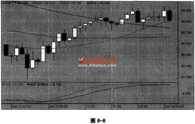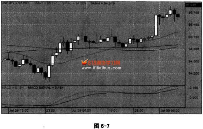 这种情况往往就是大涨之前的伏笔,要经过一段时间的挣扎,后面这一长段的盘整,一直在调整和积蓄这个力量。如果你盯着看盘的话,就会找出这种感觉。也许中间有一两个位置我们会买进去,但是没有效果,进去后立刻就会平掉出来了。虽然没有得手,但是这种几变征兆的感觉还在。一直到7曰3:00附近,从阴线十字星进入到小阳线,再到一个更大一点的小阳线,这时又会产生一个买进去的冲动。这种冲动是建立在前面盘感的基础上,盘感好的话也许就会冲进去了,这个地方如果进去了的话,你就抓住了一个比较大的机会,大概获得了200个点的盈利。 回过头来看,这种大涨大跌的行情,之前通常都是由小阴线或小阳线构成几变的征兆,一定是在看到小阳线或小阴线的时候作为进场时机,然后取到一根或几根大阳线或大阴线后平仓了解所有头寸。这种方法才称得上是“取几之势”,也就是真正的投机。 我现在给大家讲的比较机械一些,实际上也许是看见二根K线,一二进场;或者看见四根K线,一二三四进场……我说一二三是为了给你们一种节奏感,真正决定是否进场还是要靠你们的盘感。 你们平时要多琢磨这样的感觉。几变的征兆,张力的感觉有各种各样,不—定非是我讲过状态。你们在研究盘面时,要看在大阴线和大阳线之前都发生了什么事情,是怎样一种情形?你们研究琢磨进场点的时候要留意小阳线和小阴线,它们的意思和感觉分别是什么?把那些没有意义的感觉和状态过滤掉,将保留下来的东西转化成你的盘感。 我们前面讲过,我们的任务是去寻找几变的征兆,去发现发生几变机会,然后去取这几变产生的趋势。我们不能保证100%的准确,但我们是用一个很小的风险去博一个很大的盈利概率。几是最细小的,即使损失了也是微不足道的。而所有的大涨大跌都是从几变,从最小的地方开始,我们只要去抓住这些个大势就行了。至于它们之前经历过什么高点或低点,对我们来说只是作为参考,不一定具有实际的意义。 所以我们的方法相对来说比较简单,也明显比较有效,一种非常直截了当的方法。 这幅图除了我们的进场点以外,因为它是一个很明显的突破,所以即使用传统的方法,在突破前期高点的时候进场,也能抓住一波行情。但显然没有我们的进场点好。行情突破之后四根大阳线是越来越小,有很明显的多头能量衰竭的势态,到第四根阳线的时候,它已经比前面短了很多,这时就是提醒你,这一波趋势快结束了。在这种阳线越来越小的情况下,一旦出现第一根阴线,就该立刻平仓走人了。不要再有任何贪婪和侥幸的心理,前面已经赚得很多了,赚了四根阳线,先把这一波趋势的利润拿到手再说。我说过,这里面你哪怕只抓住一根大阳线,你都应该很满意了,更何况后面又抓住了三根,额外的收入。做完这样的交易,我们应该去买杯啤酒庆贺一下了。 行情背景:美元对日元看涨 交易方向:买多美元 图6-7的形态有点隐蔽。我们看29日23:00以后,到30日6:00之前的—段上涨行情,大阳线前面有三根小阳线。大家体会一下,这样的形态像不像一根曲棍球的球杆?如果你对曲棍球不熟悉,你看像不像是一根高尔夫球杆?