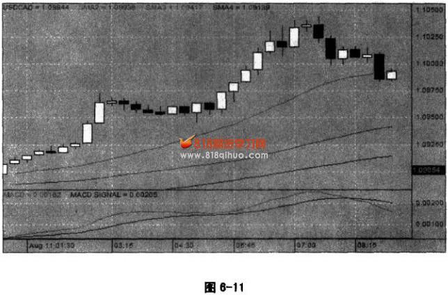另一处是2:00以后,又出现一二三连续的小阳线,这是建仓的冲动又出来了,这次抓住了一波比较大的上升行情。 如果这幅图的行情背景是看跌,今天的交易计划就只能做空,那么前面讲的这两个做多机会就不存在。不能一会儿做涨,一会儿做跌,那就违背了基本的交易原理,违背了一致性原则。 我们在交易纪律中也讲过,如果连续三单做反的话,往往不是进场点判断错了,而是背景趋势看错了》这种情况下,应该中止交易,离场观望,重新分析和判断市场环境和交易背景。 行情背景:美元对加元看涨 交易方向:买涨 主要给大家看两段行情(圈6-11)。