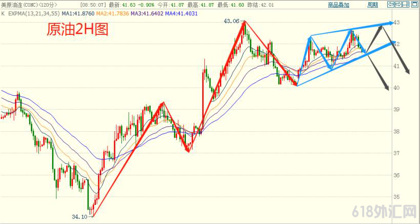 原油昨天收长上影小阳线,又在相对的高位,今天倾向震荡回落。 IEA表示,现在要知道何时能恢复正常生活还为时过早。目前,IEA预测2021年上半年油石需求都不会出现重大变动。该机构表示,库存水平仍离5月份疫情最严重时的峰值不远。昨日因辉瑞疫苗的利好消息原油走高,上破42美元关口,但晚间公布的EIA原油库存增幅大于预期,抑制油价涨势。美国11月13日当周EIA原油库存新增76.8万桶,增幅低于预期的165万桶和前值的427.7万桶。原油日线自今年低点以来反弹向上,整体仍然是对年初一波大跌的反弹修正。 2小时图看油价从33.65低点出现了反转上行走势,昨日的冲高回落日线收出长上影,预计今日出现回调的概率会比较高,可关注42整数关口一线的压力,操作上日内碰触这里受阻可以轻仓做空。上方压力位于42.00和43.00,下方支撑位于41.15和40.80。 w0203en多多交流 【以上观点,仅供参考,投资有风险,入市需谨慎;请严格止损,控制好仓位,理性操作】