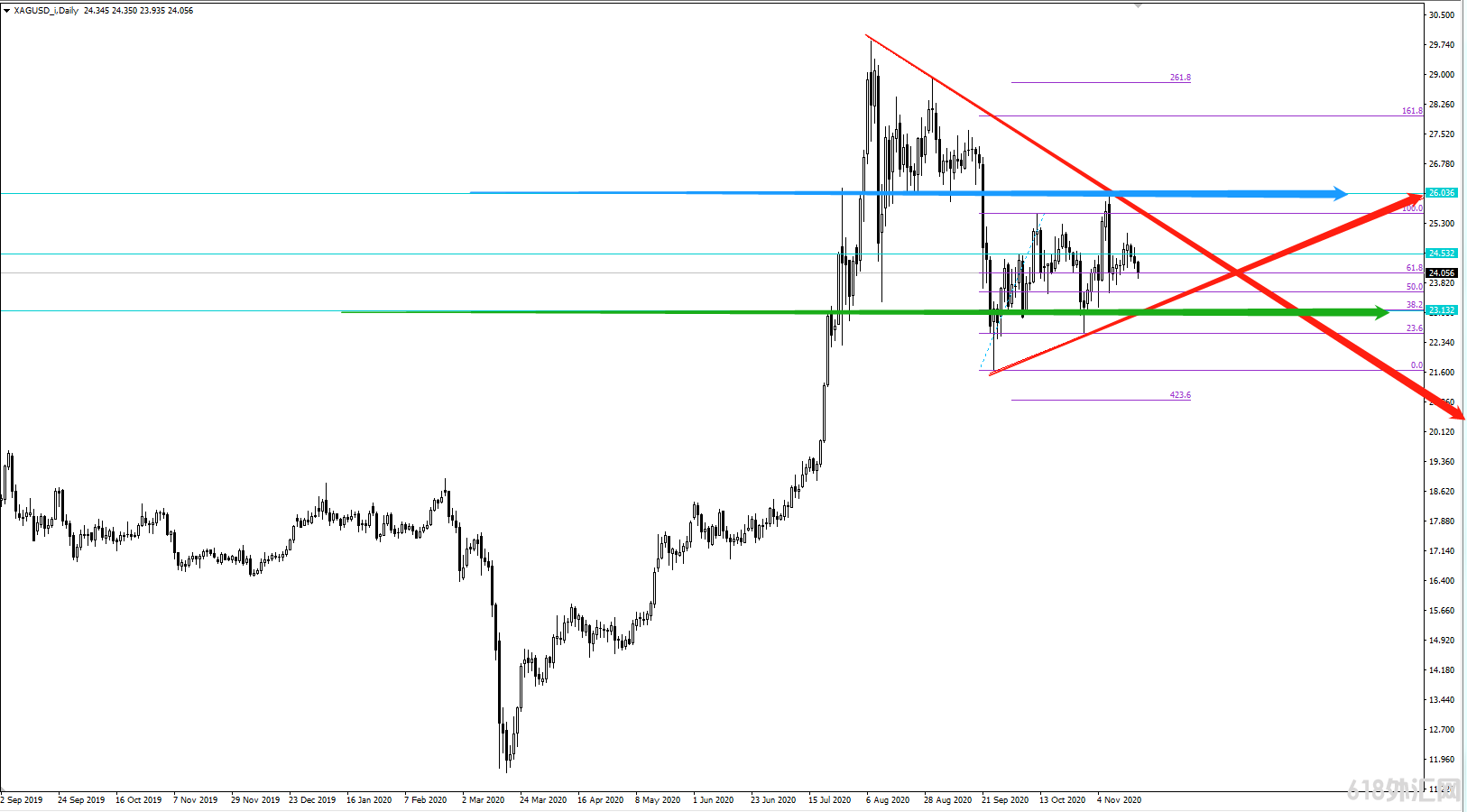 ZHAOFX:ZHAOFX财经网:白银开始走收敛,重点关注26美元多空分界线