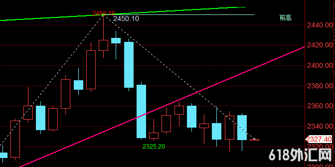 现货黄金日线收阴。高低运行在2352-2315附近区间运行。周二黄金价格震荡下跌,且反调无力。黄金收线在低位2326附近。黄金4小时图,黄金价格触及布林带下轨2315附近反弹,目前黄金价格于布林带中轨2335附近和布林带下轨2315附近区间运行。黄金1小时图,布林带向下运行形态,黄金价格小幅震荡。MACD指标向下释放能量有所缩减。整体来看,先看震荡小幅反弹,其次再看下跌。
