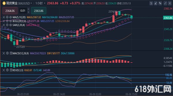 【黄金消息面分析】:周三(6月5日),黄金价格继续区间波动并上涨,与周二的价格走势形成鲜明对比,此前美国公布的经济数据好坏参半,可能促使美联储降低借贷成本。美国国债收益率下降,美元上涨,但未能抑制黄金的涨势。现货黄金收涨1.22%,收报2355.11美元/盎司;COMEX黄金期货收涨1.18%,收报2375.20美元/盎司;COMEX白银期货收涨1.76%,收报30.137美元/盎司。