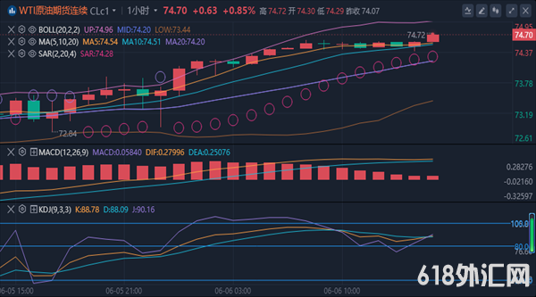 【原油消息面分析】:周三(6月5日)数据显示美国原油和燃料库存增加,同时,对美国美联储 9 月份降息的希望超过了对需求的担忧,引发油价从四个月低点反弹,并上涨超1%。#原油收盘#WTI 7月原油期货收涨0.82美元/桶,涨幅大约1.12%,收报74.07美元/桶。截至发稿,现报74.11美元/桶,涨幅1.17%。