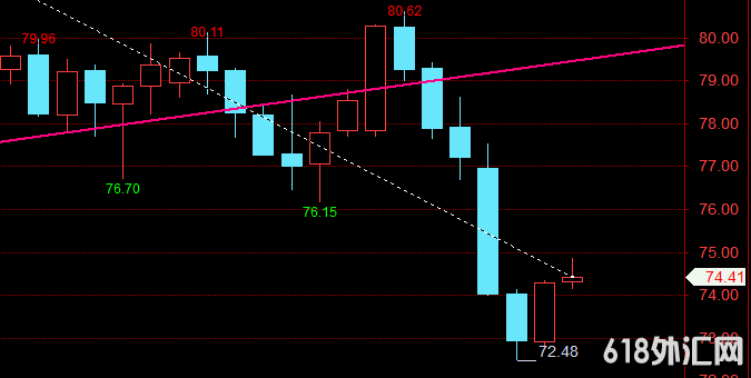 原油日线收阳。收盘在昨日高位74.3附近一线,本周目前止跌于72.4附近反弹,给原油上涨带来了一丝希望。原油4小时图,布林带走势还是处于下行形态。MACD指标向上释放能量平稳。KDJ指标于上方超卖区附近有粘合的迹象。原油1小时图,原油价格白盘上涨上方74.8附近开始回调,目前原油价格于布林带中轨74.3附近运行。KDJ指标于上方超卖区形成死叉向下运行。原油价格如果上涨,先看白盘上涨高点74.8附近,上破再看原油4小时布林带上轨76.3附近阻力。原油价格如果下跌,先看1小时布林带中轨73.7附近支撑和日线下轨73.5附近支撑。