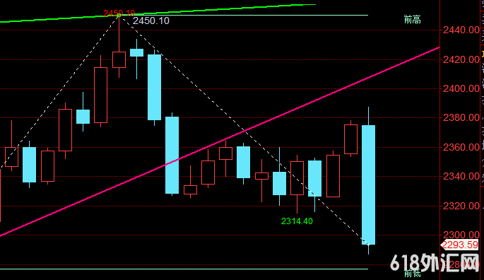 周五黄金由于遭遇大量抛售暴跌,最高触及2387附近,最低到了2286位置,整周波幅101美金,而且都是在周五完成,本周前面4个交易日都在围绕区间宽幅震荡。黄金周线图,连续三连阴收线。MACD指标向上释放能量大幅缩减。KDJ指标呈现死叉向下运行。黄金日线图,大阴柱收线,且收在低位2393附近,也是布林带下轨附近一线。黄金4小时图,黄金价格穿插布林带高低位,布林带运行区间再次扩大。黄金于不连带低位附近运行。MACD指标向下释放能量爆增,KDJ指标向下运行。黄金1小时图,布林带开口,黄金价格向下运行。MACD指标向下释放能量有所缩减。KDJ指标于下方超卖区运行。