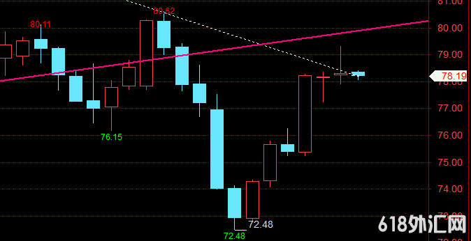 原油日线收阴。原油四小时线来看,在冲高79上方后随着EIA数据公布回吐涨幅,目前油价运行在布林带中上轨之间。MACD指标向下释放能量有所减缓。KDJ指标向下运行触及下方超卖区附近。4小时图伴随一波探高回落收盘至趋势线之内,短线趋势线还是有所受阻,结合小时图带动上轨承压收口,局部进入震荡蓄势,目前4小时图在79.30之下轻微承压,短线以浪形空间来看,从72.55做为一浪上涨,目前进行回踩修正,