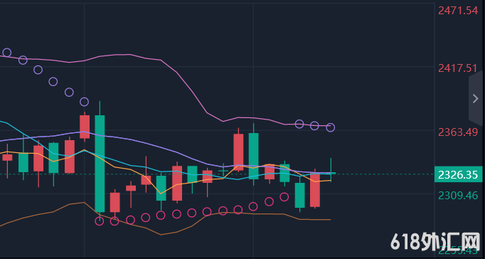 黄金周线收小十字阳线。各项指标与布林带走势有所背离,根据盘面走势预计下周小幅回踩后反弹,高位对比上周会有所突破。黄金日线图,黄金价格于布林带中轨2327附近一线运行。且收小十字阴线。各项指标并未出现明显的走势意图,预计周一白盘走势会出现小幅回踩的情况。欧盘出现反弹的几率会比较大。综合以上,周一黄金盘面整体来看,反弹高空为辅,回踩低多为主。黄金价格如果上涨,先看上方2335附近阻力,上破则看上方2342附近阻力。黄金价格如果下跌,先看下方2317附近支撑,下破则看下方2310附近支撑。