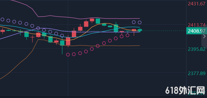 黄金从周线结构来看,上周金价探底回升,目前已转阳偏强,中轨线对其产生买盘支撑,但上方趋势线压力仍在对其产生动力限制,进一步走高仍需突破历史高点2449,若突破将进一步上看布林带上轨2480,下方则继续关注周五低点2390附近,跌破将进一步看至2350附近。黄金日线图,黄金价格上涨触及布林带上轨2417附近后进行小幅回踩震荡运行。黄金4小时图,布林带走势向上运行形态。MACD指标向上释放能量逐步递减。黄金价格如果下跌,可以先看布林带中轨2395附近一线。黄金1小时图,布林带走势合口平稳运行。黄金价格于布林带中轨2408附近运行。布林带走势向下运行,且出现了粘合和的迹象。整体还是处于多空拉锯的状态。