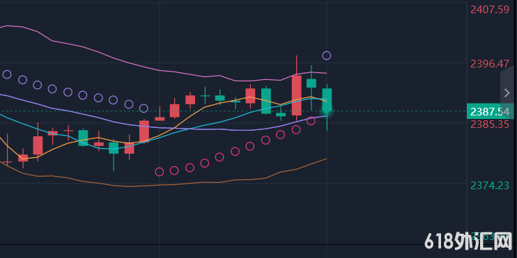 黄金日线图:白盘黄金先跌后涨,区间运行在2376-2392附近。晚间黄金价格有所上涨触及上方压力2397附近回踩,目前持续在2390关口附近震荡,形成多空拉锯的形态。