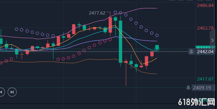 黄金4小时图:布林带走势向上运行,黄金价格也是高涨的形态。周五晚间的一根大阴柱打破运行走势。但收线后黄金价格反弹于布林带中轨2437附近之上运行。这也再次给多头带来了希望。4小时级别黄金价格上涨先看MA5均线2454附近,上破看延续。下方看布林带中轨2437附近,下破看2410附近。