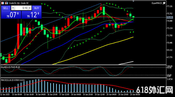 受避险需求与美元强势交织影响,现货黄金周一在亚洲时段未能延续上涨动能,3400美元关口再度构成阻力,吸引卖盘涌现。 技术面来看,黄金走势陷入震荡整理区间。目前金价在3400美元附近遇阻,短期内呈现整理格局,市场观望气氛浓厚。若黄金有效跌破100期简单移动均线(SMA)及短期上升通道支撑线,可能引发新一轮抛售浪潮,目标下看3320美元附近,进一步或跌破3300美元整数关口。反之,若多头重新占据主动并突破3400美元,则将迎来上行空间,初步阻力见于3430美元,随后为3450美元一线,即上周所创近两月高点。如市场避险情绪显著升温或美元走弱,金价或有望冲击3500美元的历史高位。黄金策略:日内回撤触及3348-3345范围做多,3340补仓一次,防守3335,目标3365-3375上破持有;若先反弹触及3388-3392范围做空,防守3340,目标3370-3360; 受伊以冲突消息影响,布伦特原油期货一度上涨5.7%,最高触及79美元,随后略有回落;WTI原油上涨逾2%,报75美元上方。交易员重新评估伊朗可能的报复行动,包括封锁霍尔木兹海峡这一全球原油运输命脉。 从日线图来看,WTI原油价格自6月中旬低点约72美元反弹,周一盘中一度突破76美元,创下近半年新高,整体维持强势多头格局。目前价格已上穿20日与50日均线,短线形成金叉支撑上涨动能。MACD双线位于零轴上方,红柱持续扩大,表明上涨动能增强;14日RSI指标逼近70临界线,虽未进入超买,但需警惕短线回调风险。若价格站稳76美元上方,将打开通往78.80美元(4月中旬高点)和80美元整数位的大门。下方初步支撑位看向20日均线约74.20美元,进一步支撑在73美元关键颈线位。原油策略:回撤触及74.3-74.0范围做多,防守73.5,目标75.5-76.0上破持有;