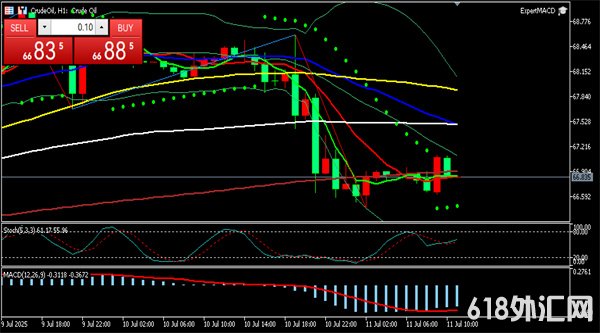 从日线图来看,美原油(WTI)价格在跌破69美元整数关口后,已跌穿短期均线支撑,技术结构呈现疲弱走势。当前价格在66.50美元附近获得部分买盘支撑,但若进一步跌破该位,下方可能测试65.00美元至64.20美元区间,为前期震荡区域。指标方面,MACD死叉放大,RSI下行至中性偏弱区域,显示下行动能仍在释放中。油价短期修正并不代表市场风险解除,OPEC的需求下调与特朗普新一轮关税措施交织,正在对中期油价形成双重压力。亚洲大国经济放缓令全球能源结构调整更具现实意义,而美国的关税政策则可能直接削弱全球原油的实际消费能力。