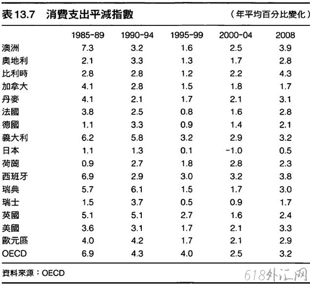 评价标准: OECD 1990年至2008年消费支出平均指数每年平均上涨4.6%,从1990年的6.5%下降到2008年的3.2%。
