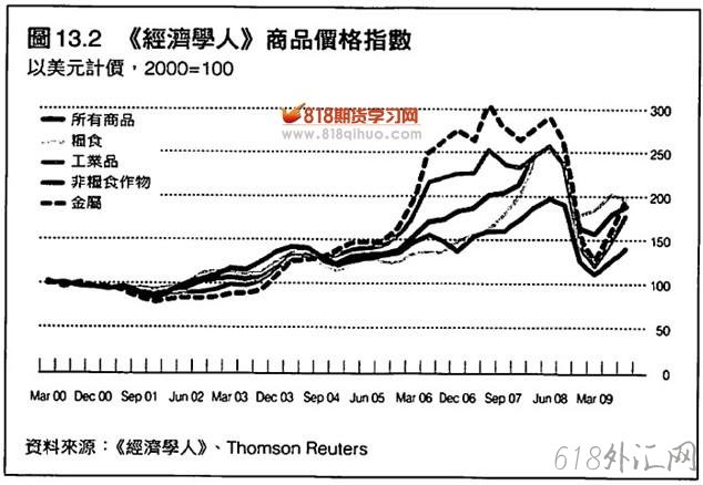 根据世界银行的分析,糖的价格变动幅度是柳橙的11倍以上。 商品中,糖的价格最不稳定,柳橙正好相反。 另外,商品价格的变动幅度从1960年代开始更加激烈。 与1970年代石油价格上涨了8倍不同,其他商品的价格发生了急剧的变化。举 ![]() 例来说,粮食价格于一九八〇年代下跌而木材价格上涨。这些冲击与因应的政策因此引发出许多经济问题。 影响价格的因素 视价格系受到需求、供给或两者的影响而定,商品可以区分为三大类型。 需求。像金属与矿物等工业原料的价格会根据需求的变化而上下波动,主要反映工业化国家的经济状况。经济衰退会抑制需求与价格。供给往往比较稳定且可以预期。 随着工业化国家于一九七〇与一九八〇年代发展出许多节省原料的技术,对金属的需求随之减少。一九九〇到一九九三年之间,《经济学人》的美元金属价格指数下跌超过三十个百分点。到一九九四年年中时,该指数已回升超过先前的起跌点,到一九九五年时又跌破一九九〇年的水平。到二〇〇一年十一月时,指数继续下跌39%。拜中国需求之赐,该指数之后反转向上,到二〇〇七年六月时已经飙升284%,但随着全球经济衰退,指数到二〇〇九年三月时下跌了58%。 金属 工业用金属的价格自二〇〇八年年初以来的涨跌,反映出世界经济起伏不定的特性。于二〇〇八年四月触顶的铜价,至二〇〇九年十二月三十日时已经来到最低点,相对于顶点的跌幅超过三分之二。镍的价格从顶点到谷底暴跌了72.3%。随着大多数富裕国家恢复经济成长,金属价格也同步恢复。目前的铜价比去年年初还要高。锌的价格已经从去年十二月的低点翻涨一倍,不过依然较二〇〇八年年初的价格低了2.9%。截至十一月二十四日的一年期间,镍的价格已经上涨了近三分之二。 ![]() 蠢蠢欲动 粮食价格再度缓步上涨 根据《经济学人》的粮食价格指数显示,目前全球的粮食价格较二〇〇八年年初时下跌了 2.2%,该指数已经从去年七月的最高点下跌几乎四分之一。占指数权重最高的小麦价格,几乎比二〇〇八年一月的价位低了将近三分之一。稻米的价格曾经在去年四月来到二〇〇八年年初价位的二·五倍以上,现在已经腰斩,但依然接近二〇〇八年 年初价格的一·五倍。过去一个月来糖价稳定上扬,这意味目前的糖价处于去年年初以来的最高点。 ![]() 供给。未经计划的供给变动对粮食价格的影响最大。举例来说,全球植物油价格主要取决于美国大豆产区的气候与粮储政策。美国于一九九八年发生干旱,减产的结果造成粮价上涨。随着农作物恢复生产且存粮回升,粮食价格在一九八〇年代晚期与一九九〇年代早期下跌。 供给与需求。像棉花与橡胶等非粮食作物容易同时受到供给与需求两者变化的影响。 |