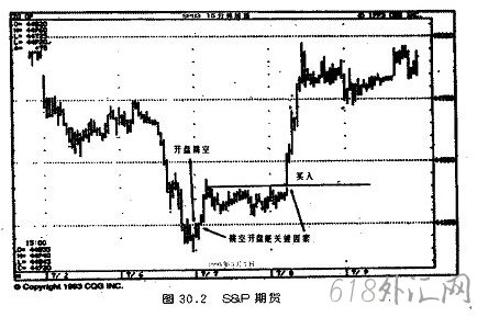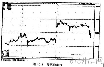 今天的盘势是判断明天盘势的重要线索。图30.2是一个实际的例子。重点在于:当日冲销必须在短期趋势的前后关联中交易。