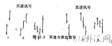 图30.3中,我列示一些条形图的模式,包括:开盘一最高一最低收盘,这可以透露短期的趋势,以及隔天的可能发展。请详细研究这些模式,并将它们纳入你的记忆中。短期趋势经常会与中期趋势相反,而且通常会待续一天至三天。