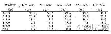 该表显示了“道琼斯工业指数”每月的价格变动率。 整个54年分为五个相等的期间。 各期间复盖了较大的126个月,显示了各期间价格变动率的分布。 根据表内的资料,可以知道每个期间的价格变动情况,可以估计将来价格变动的可能性。 例如,平均过去54年的资料可以发现,在几个月价格变动为0-1.9%的区间中,价格变动为42.1%。 1984年1月以来,这一概率略有增加,为45.1%。 如果销售未扣除的选择,就可以使用这份资料来评价胜算。 请注意,自1973年1月以来,价格变动区间为8%~9%,10%。 的概率明显增加。 4%~5.9%的区间概率会减少。 这表明,如果某个月价格变动4%~5.9%,价格变动很可能会进一步增加。 如果详细分析带格内的资料,也可以发现其他。